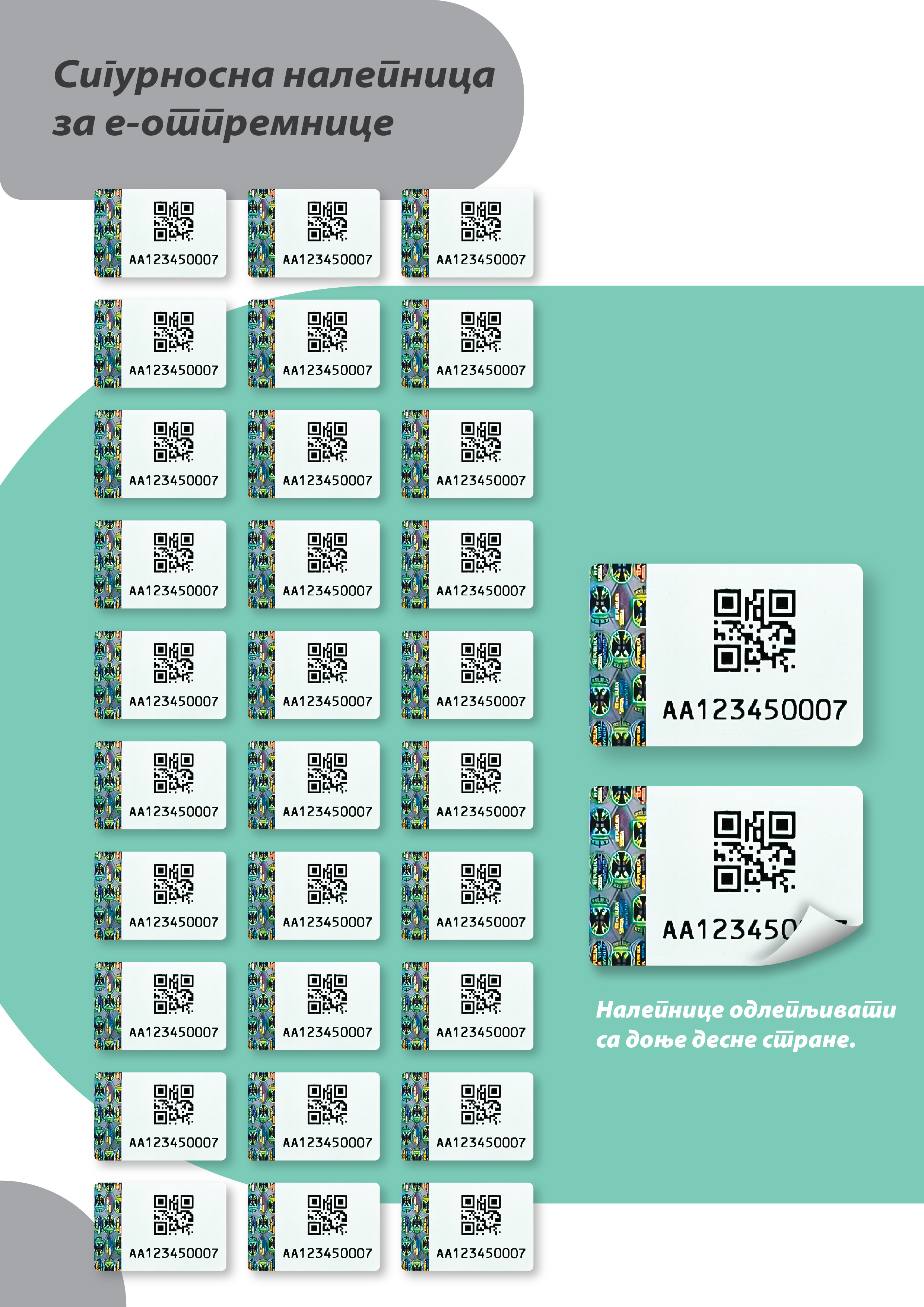 - Налепнице се производе и испоручују у сетовима (1 сет = 3 комада налепница са истом нумерацијом за једну отпремницу), у паковањима од 100 и 1.000 сетова;